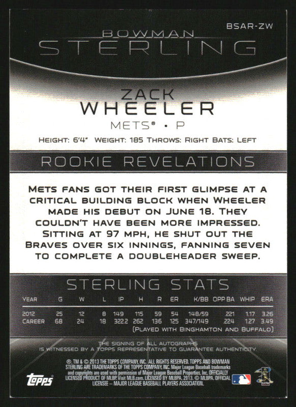 2013 Bowman Sterling Rookie Autographs #BSAR-ZW Zack Wheeler RC Auto