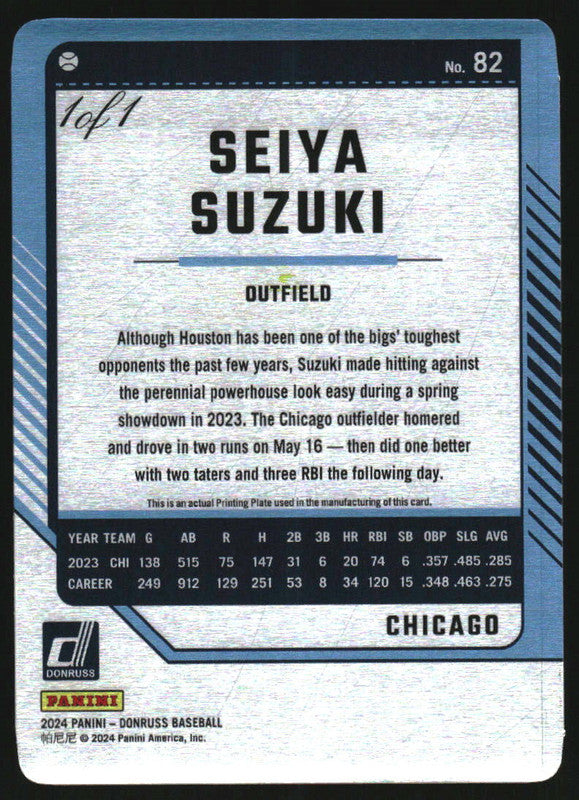 2024 Panini Donruss Printing Plate Black #82 Seiya Suzuki 1/1