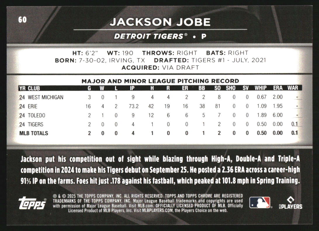 2025 Topps Chrome Black Gold Refractors #60 Jackson Jobe RC /50