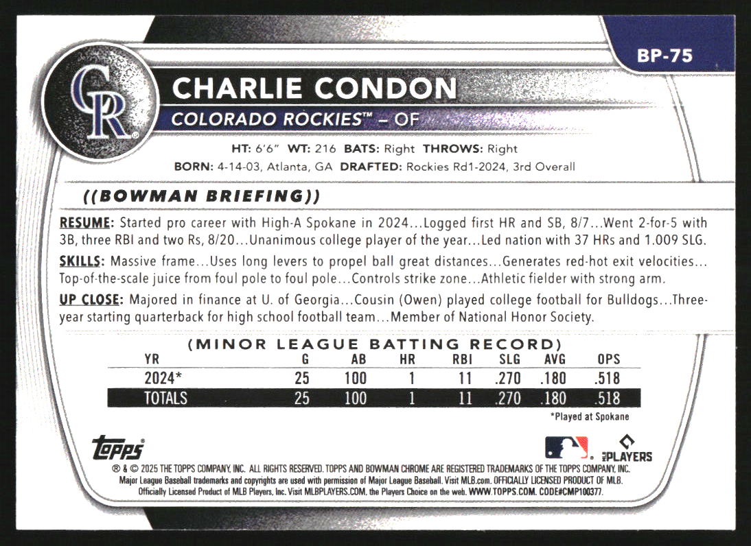 2025 Bowman Purple Border #BP-75 Charlie Condon RC /250