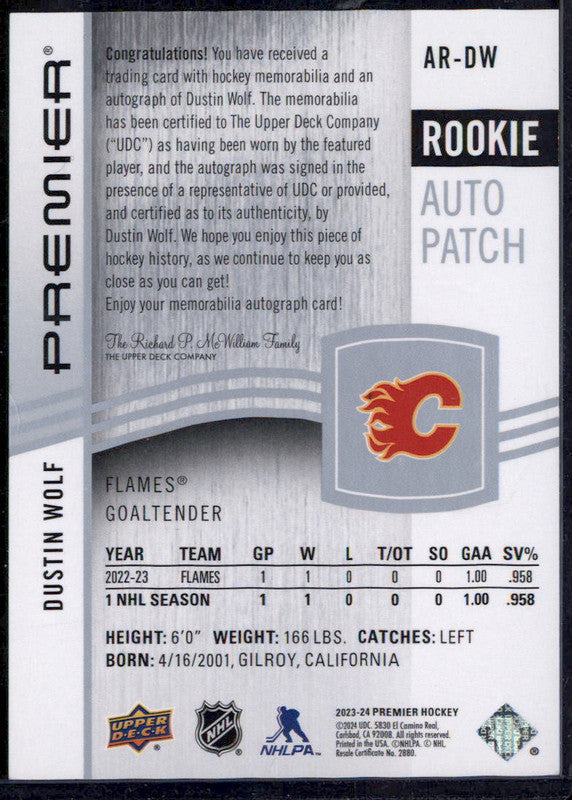 2023 Upper Deck Premier Acetate Rookie Auto Patch #ARDW Dustin Wolf RC Auto /249