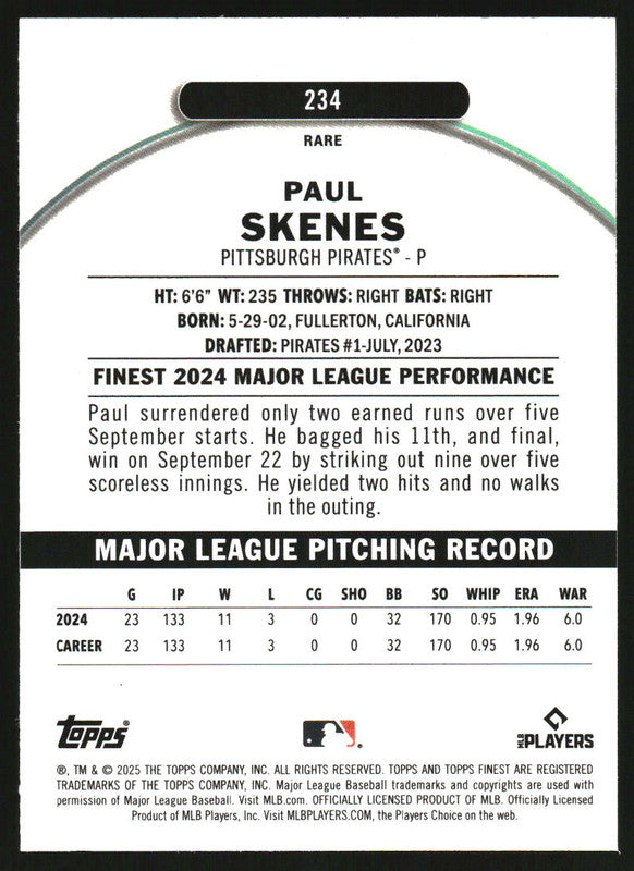 2025 Topps Finest Rare Sky Blue Refractor #234 Paul Skenes /150