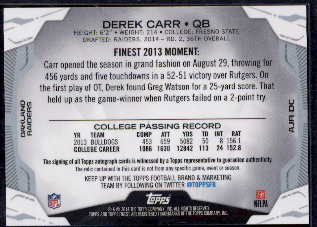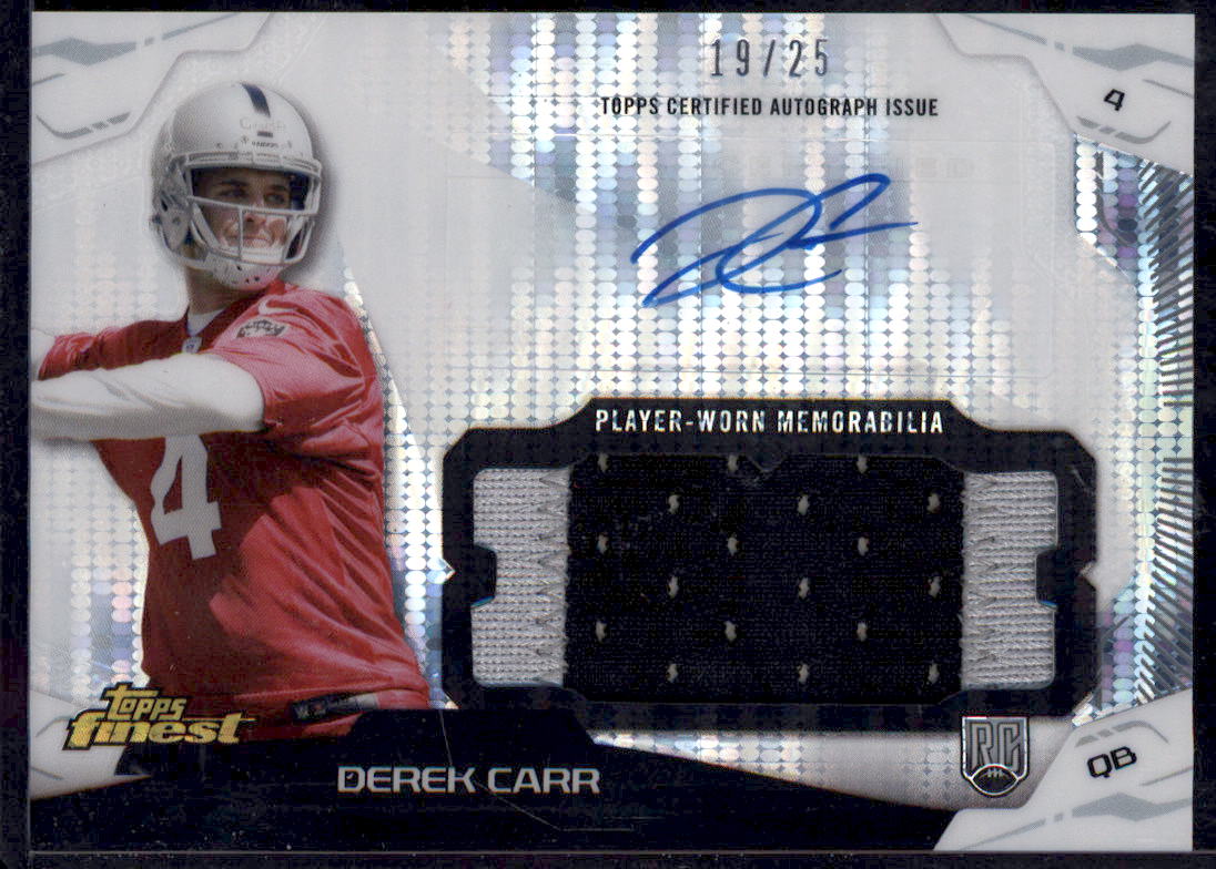 2014 Topps Finest Jumbo Jersey Auto Pulsar Refractors #AJR-DC Derek Carr RC /25