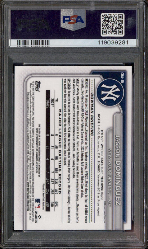 2024 Bowman Chrome Rookie Auto Gold Refractor Jasson Dominguez RC /50 PSA 9