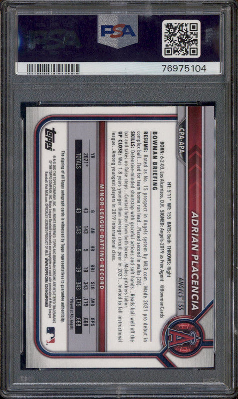 2022 Bowman Chrome Prospect Auto Red Wave #CPAAPA Adrian Placencia RC /5 PSA 9