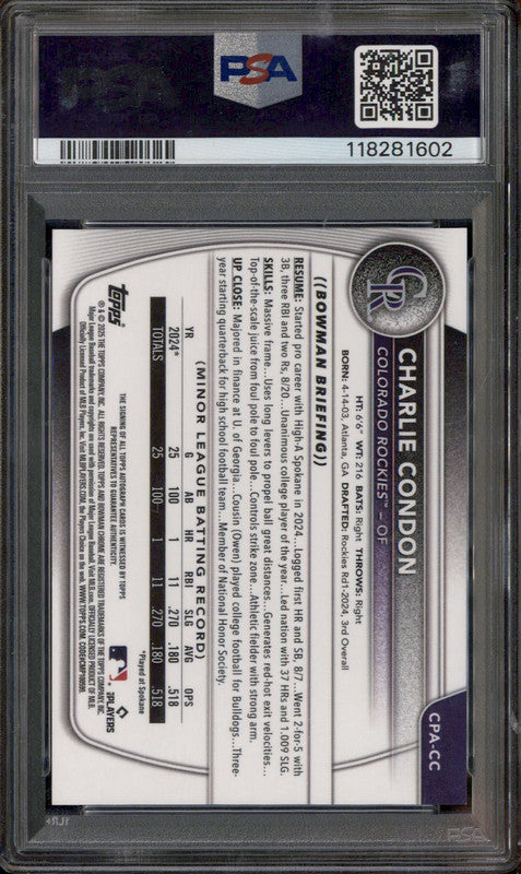 2025 Bowman Chrome Auto Green Shimmer #CPACC Charlie Condon RC /99 PSA 9