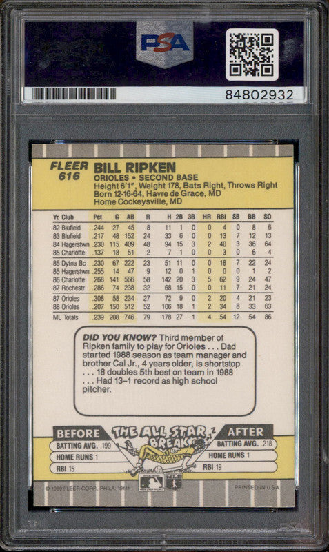 1989 Fleer #616 Billy Ripken Rookie Autograph RC Auto PSA 10