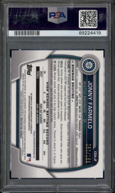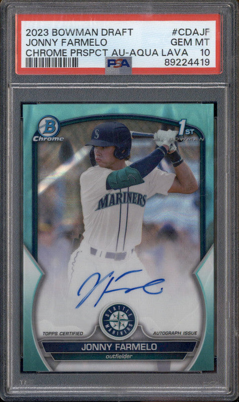 2023 Bowman Draft Chrome Autograph Aqua Lava #CDAJF Jonny Farmelo RC /199 PSA 10