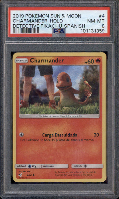 2019 Pokemon Sun & Moon Detective Pikachu Spanish #4/18 Charmander Holo PSA 8