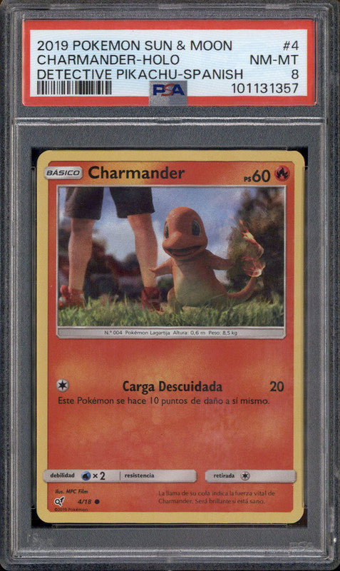 2019 Pokemon Sun & Moon Detective Pikachu Spanish #4/18 Charmander Holo PSA 8