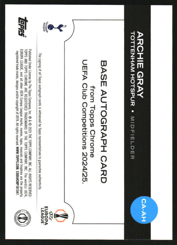 2024-25 Topps Chrome UEFA Autographs Blue Refractor #CA-AH Archie Gray Auto /150