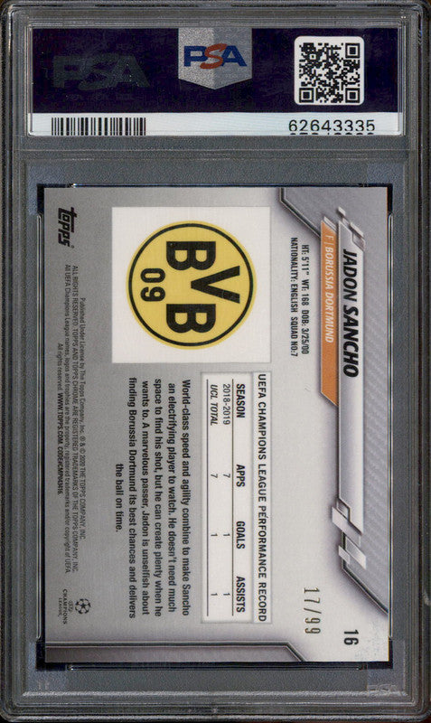 2019 Topps Chrome Sapphire Champions League Yellow #16 Jadon Sancho /99 PSA 10