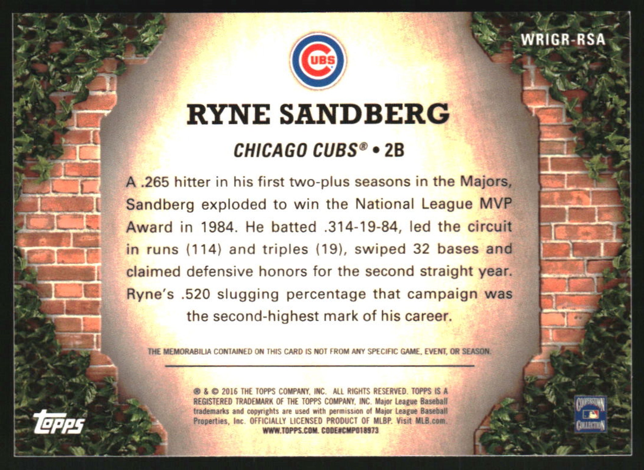 2016 Topps 100 Years at Wrigley Relics #WRIGR-RSA Ryne Sandberg /99