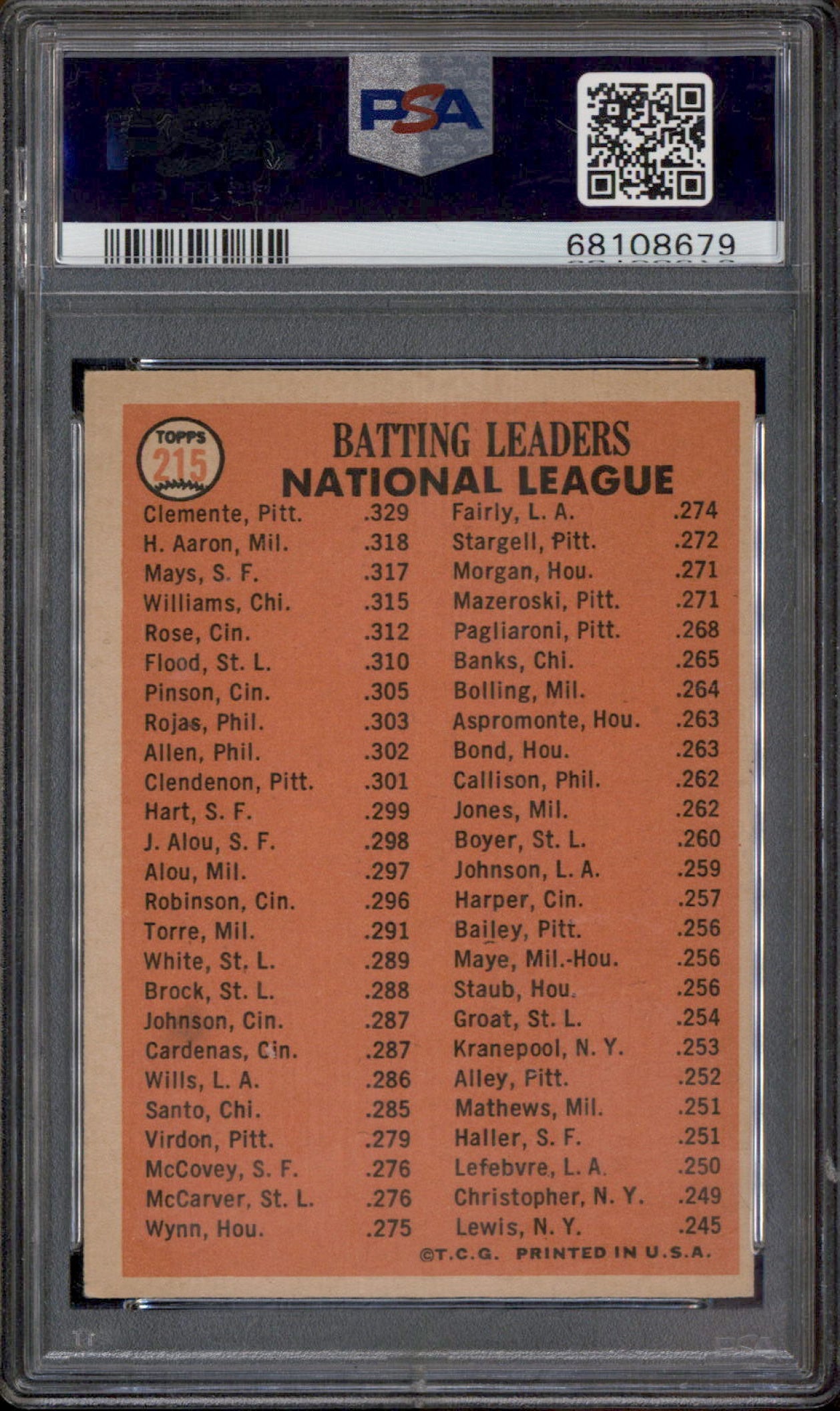 1966 Topps #215 Bob Clemente Hank Aaron Willie Mays League Leaders PSA 3