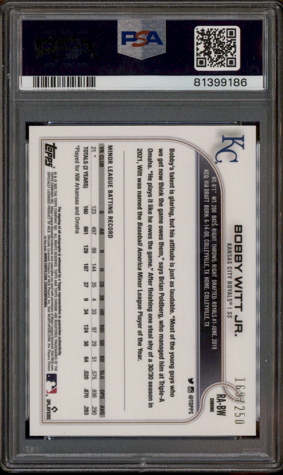 2022 Topps Chrome Rookie Purple Refractor Bobby Witt Jr. RC Auto /250 PSA 10