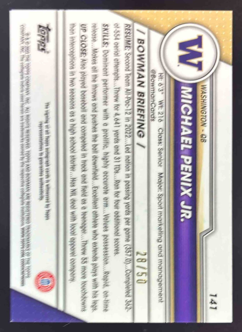 2023 Bowman University Chrome Gold Refractor #141 Michael Penix Jr. Auto /50
