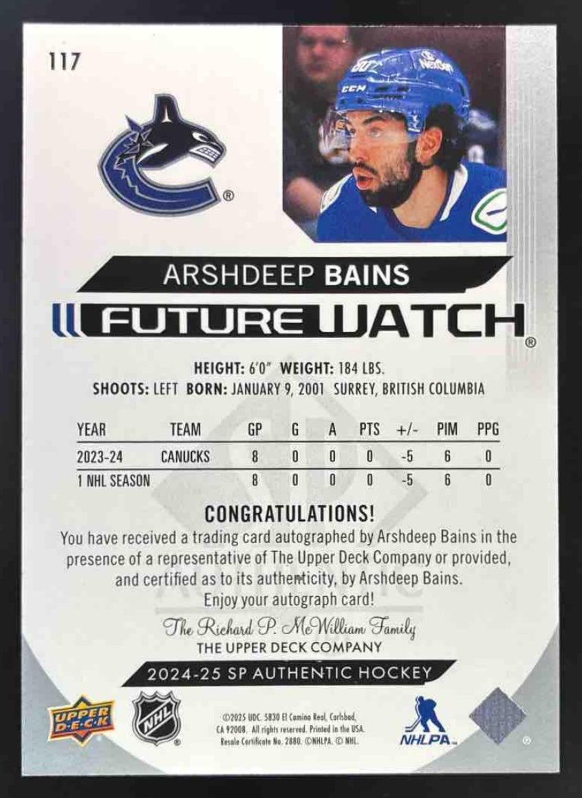 2024-25 Upper Deck SP Authentic #117 Arshdeep Bains Autograph RC Auto /999