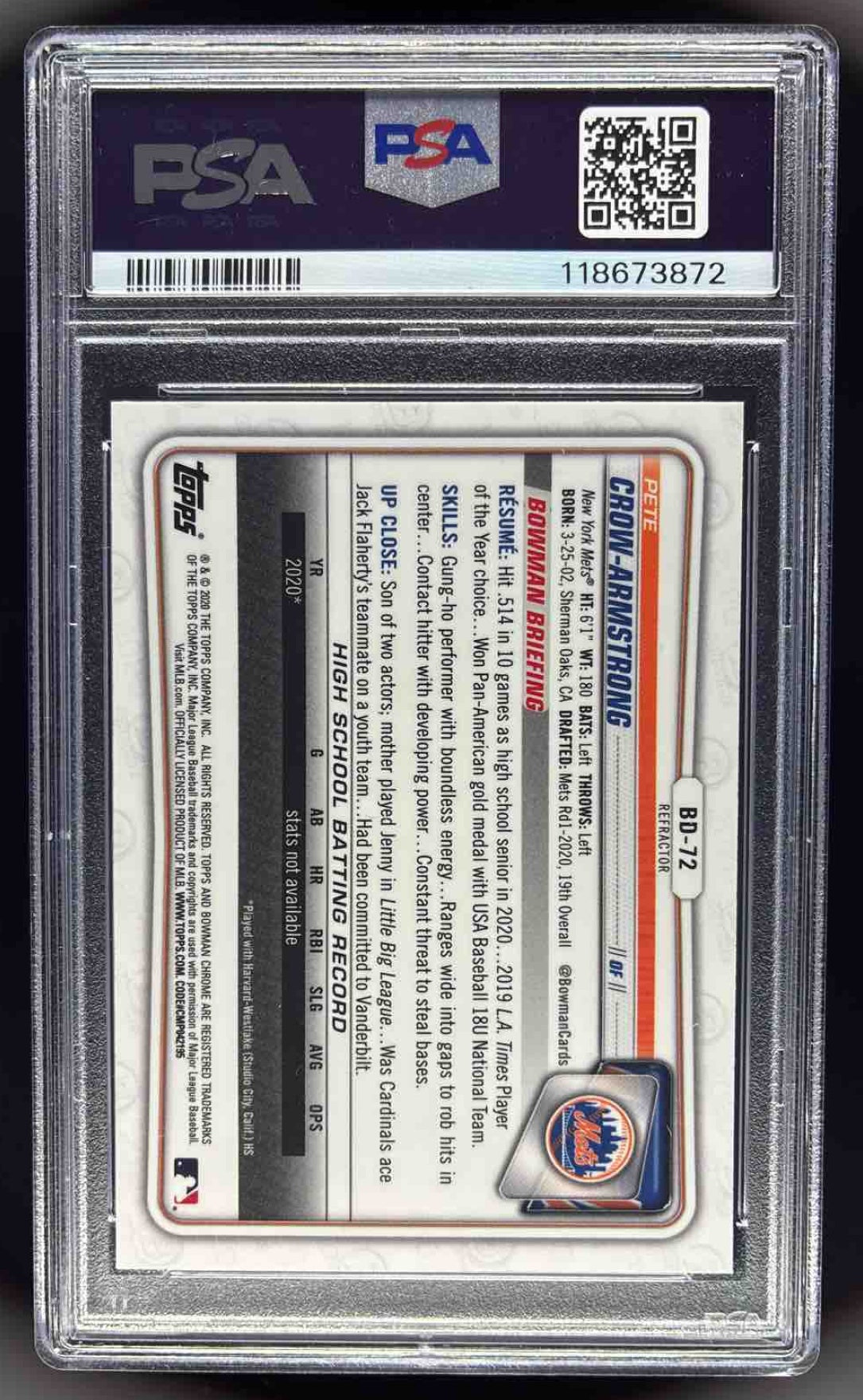 2020 Bowman Draft Chrome Refractor #BD-72 Pete Crow-Armstrong RC PSA 9