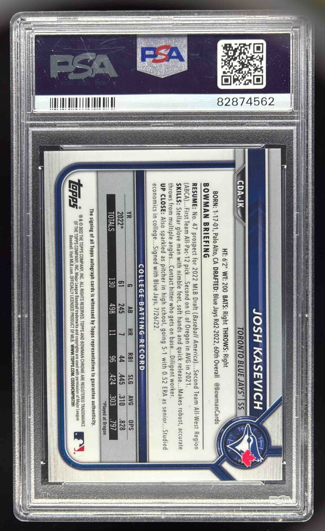 2022 Bowman Chrome Purple Refractor #CDA-JK Josh Kasevich RC Auto /250 PSA 10