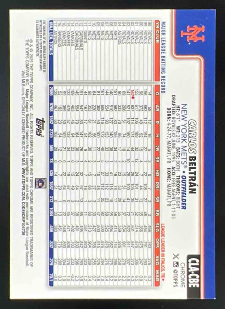 2025 Topps Chrome Chrome Legends Autographs #CLA-CBE Carlos Beltran Auto /50