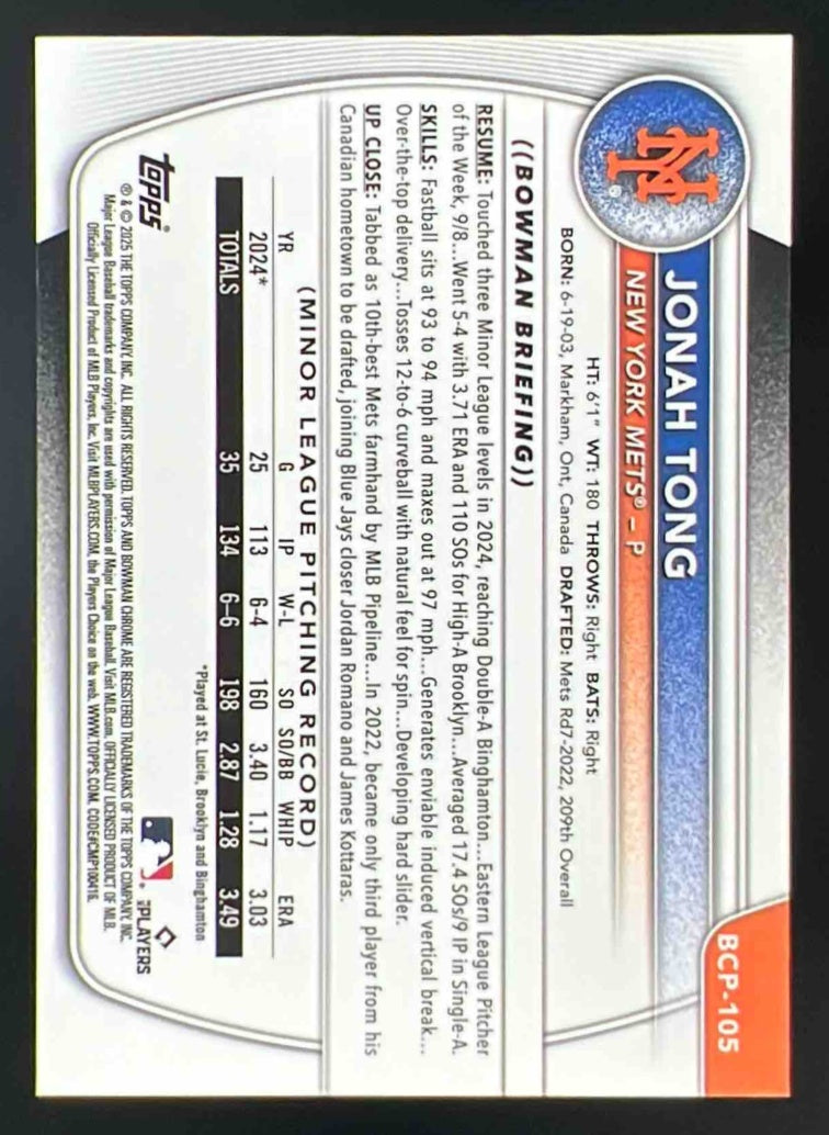 2025 Bowman Chrome Prospects Gold Shimmer Refractor #BCP-105 Jonah Tong RC /50