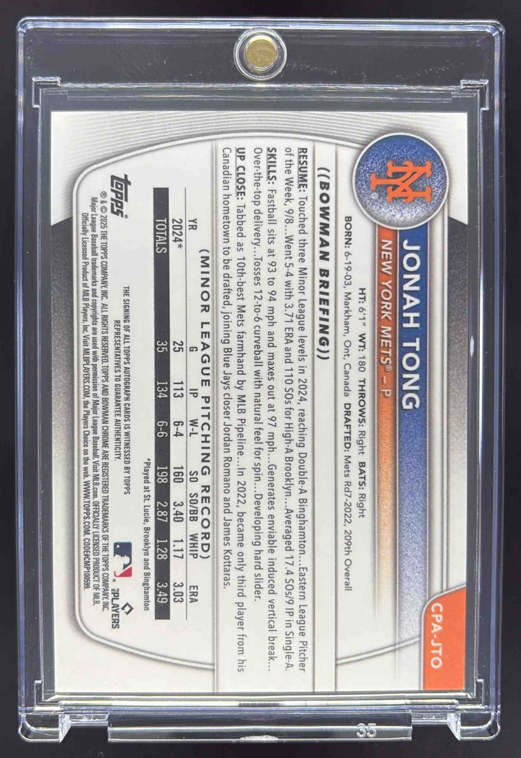 2025 Bowman Chrome Autographs Blue X-Fractor #CPA-JTO Jonah Tong RC Auto /150