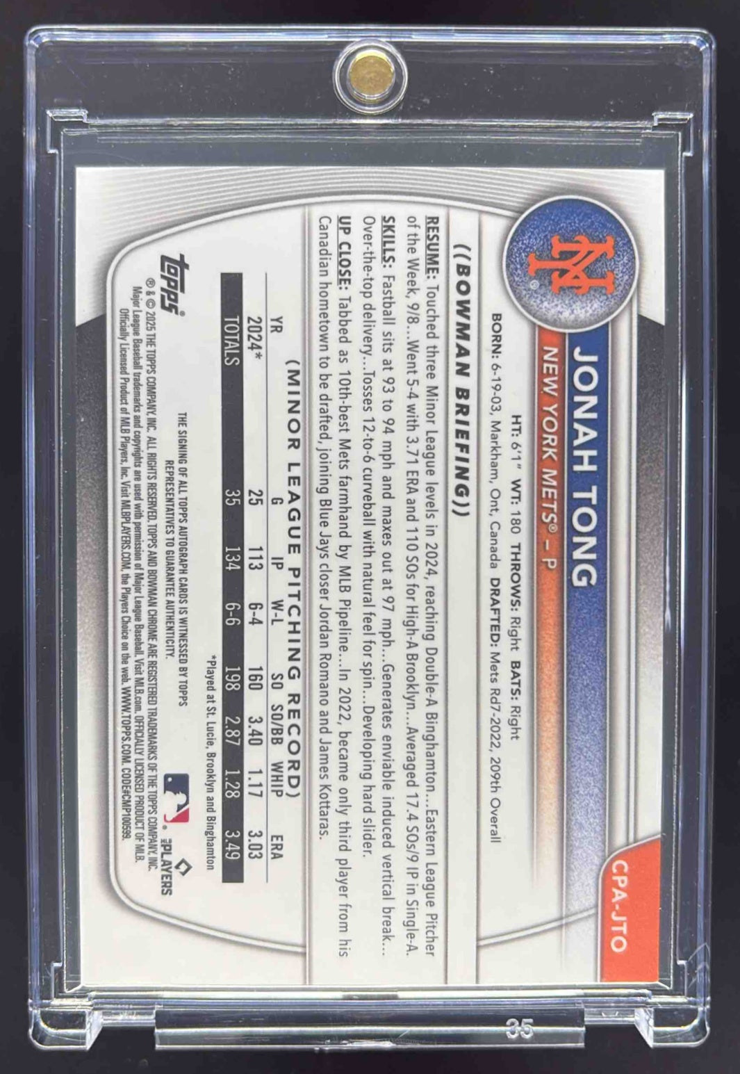 2025 Bowman Chrome Autographs Yellow Refractor #CPA-JTO Jonah Tong RC Auto /75