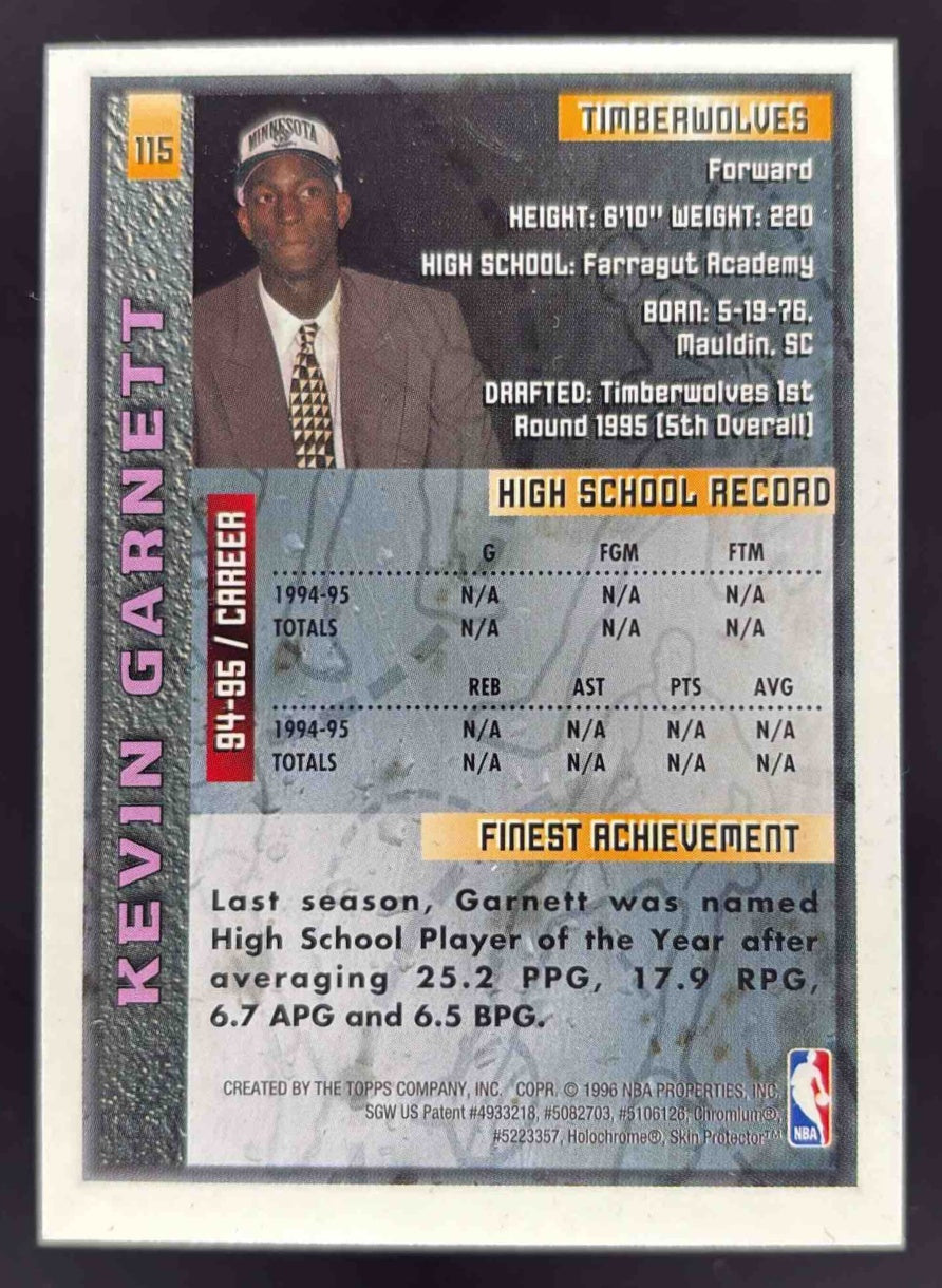 1995-96 Topps Finest #115 Kevin Garnett RC