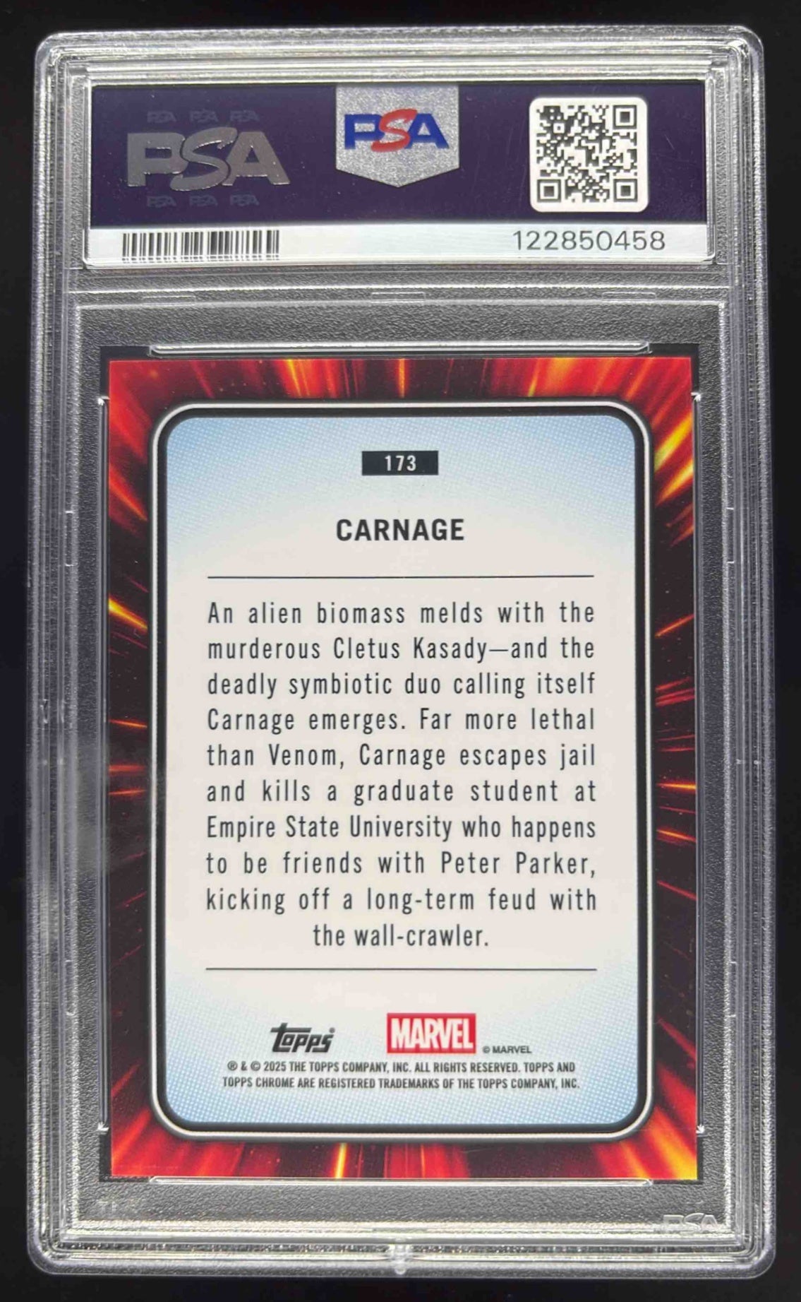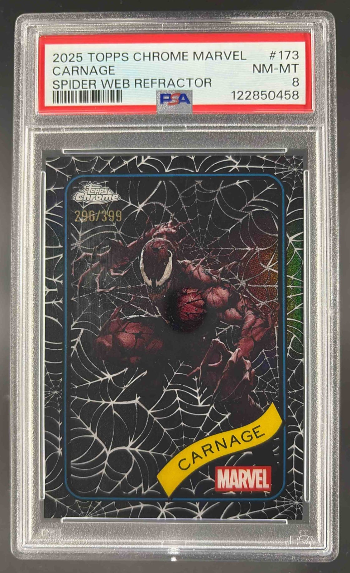 2025 Topps Chrome Marvel Spider Web Refractor #173 Carnage /399 PSA 8