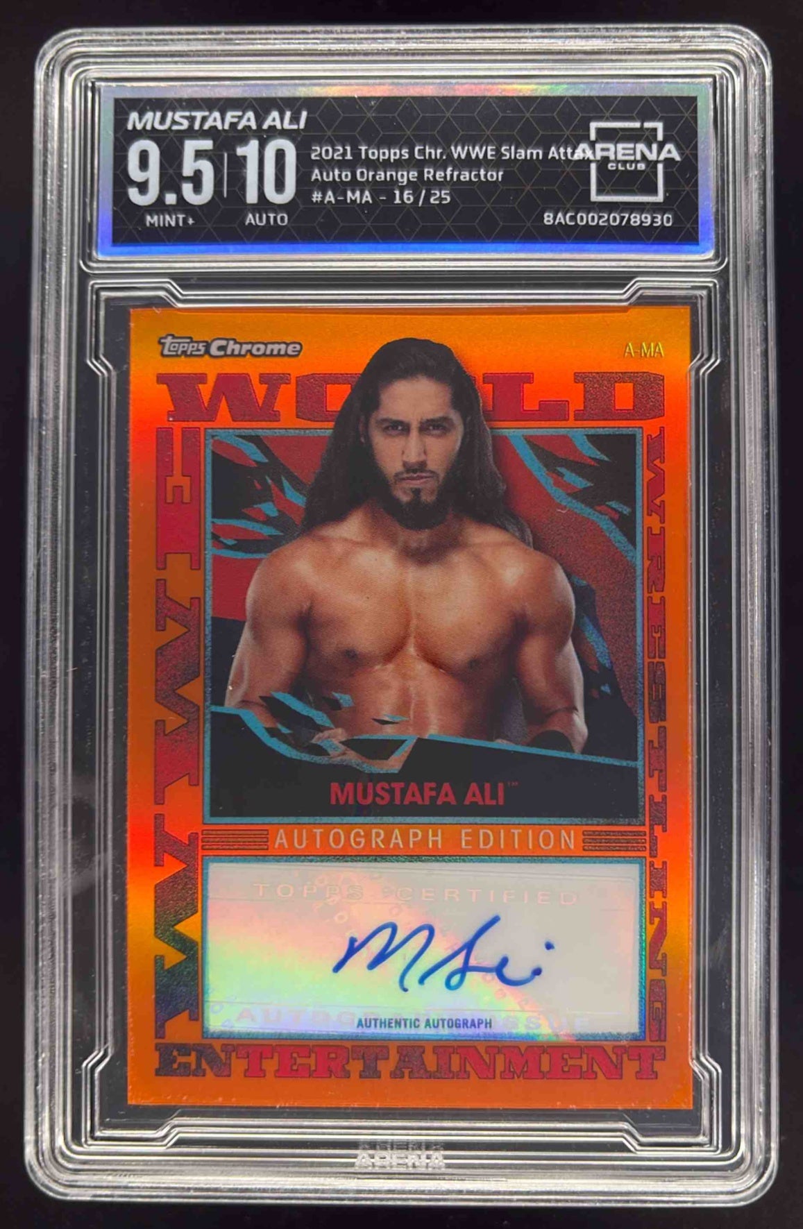 2021 Topps Chrome Slam Attax WWE Orange Refractor Mustafa Ali Auto /25 Arena 9.5