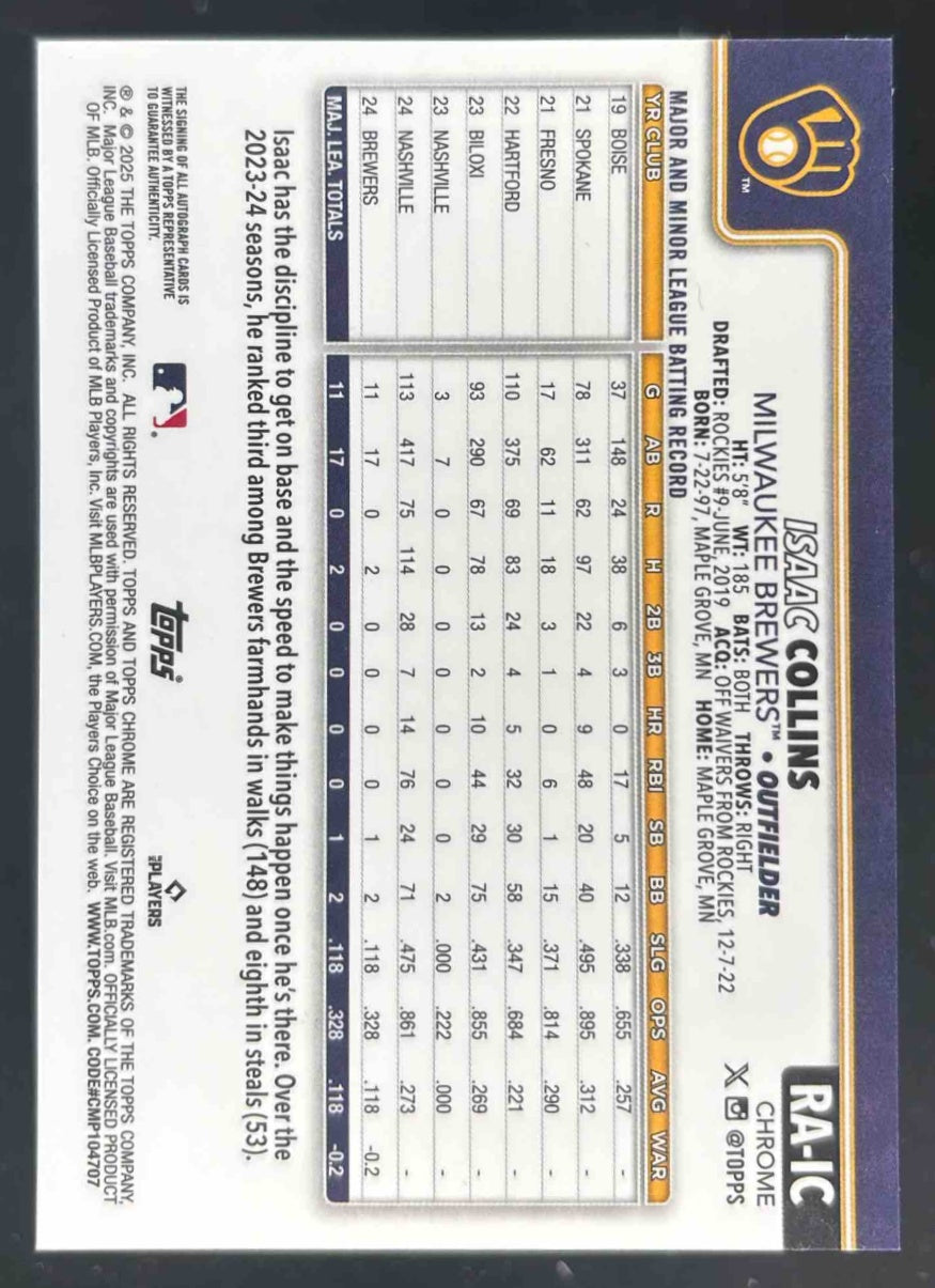 2025 Topps Chrome Rookie Autograph #RA-IC Isaac Collins RC Auto