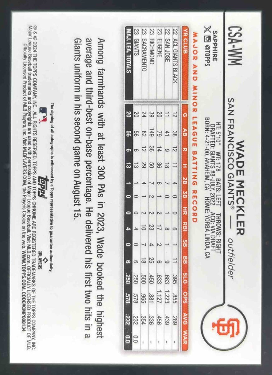 2024 Topps Chrome Sapphire Gold Refractor #CSA-WM Wade Meckler RC Auto /50