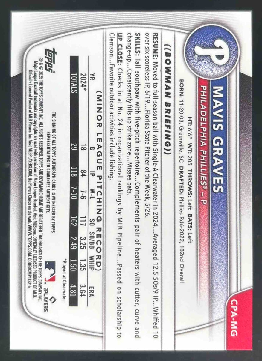 2025 Bowman Chrome Autograph Speckle Refractor #CPA-MG Mavis Graves RC Auto /299