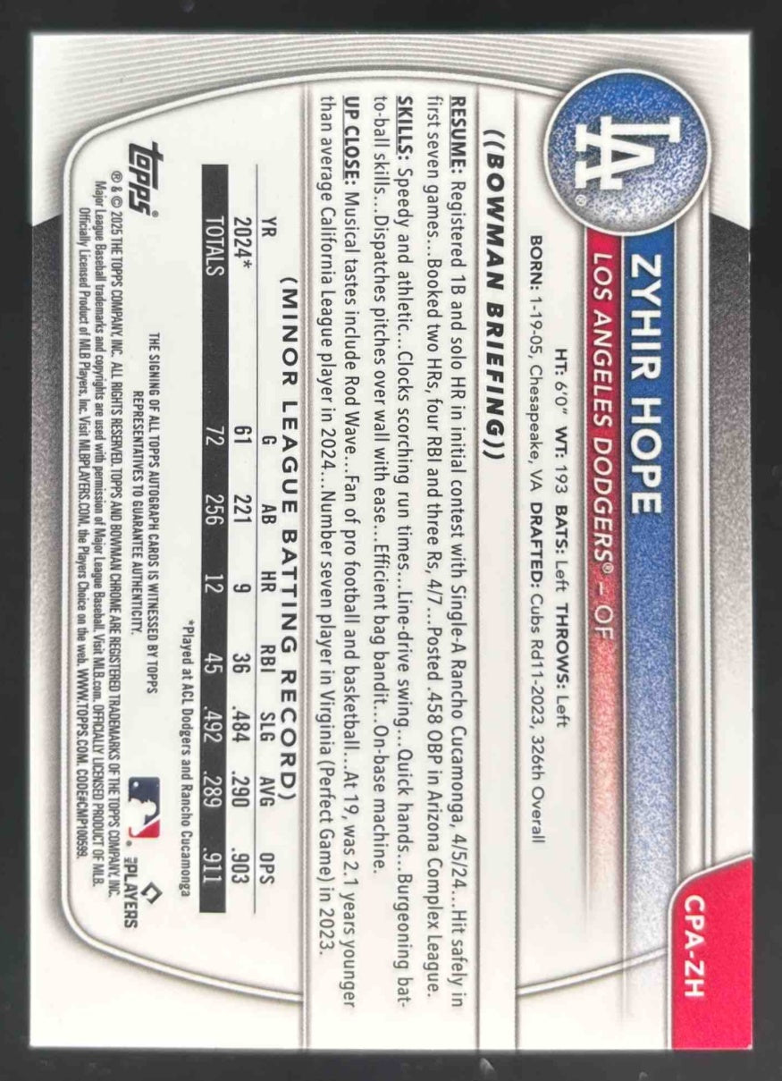 2025 Bowman Chrome Autographs Green Lava Refractor #CPA-ZH Zyhir Hope Auto /99