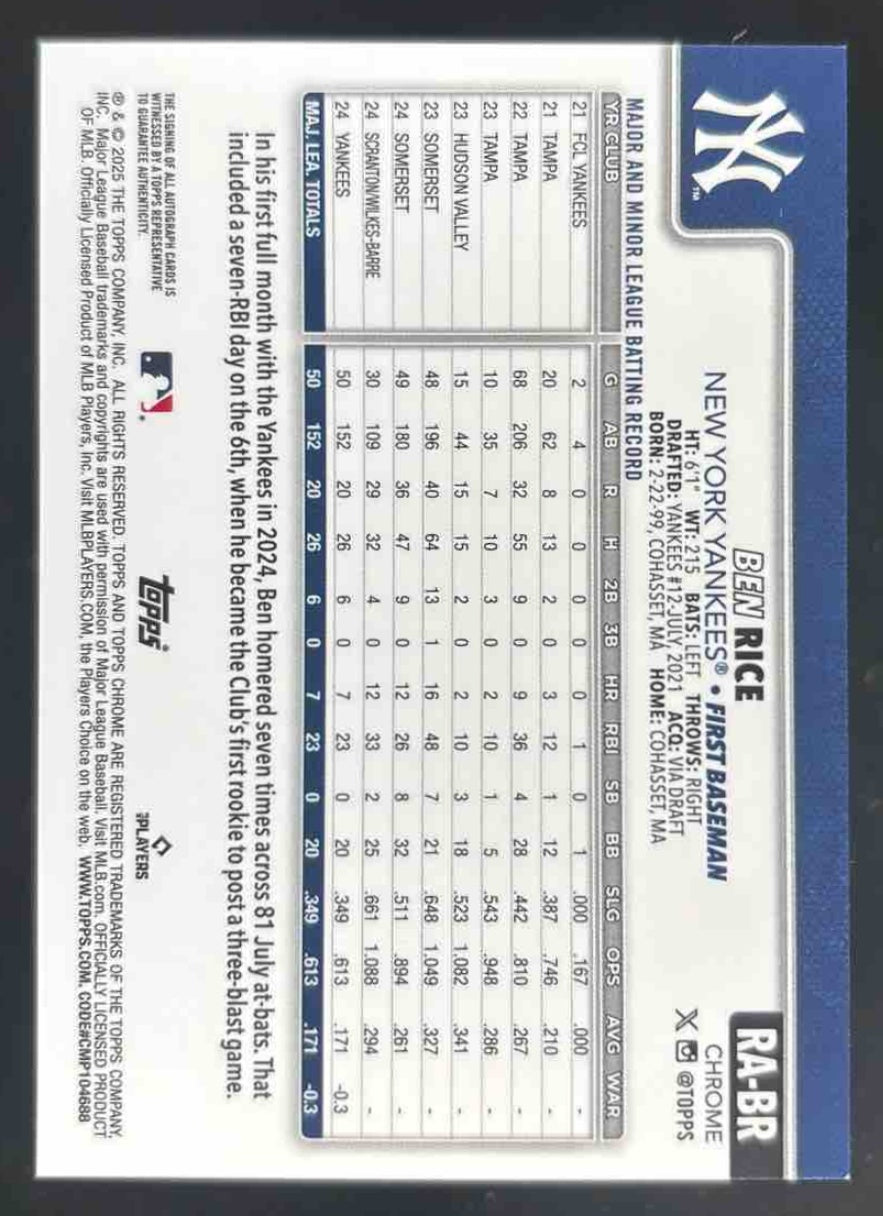 2025 Topps Chrome Rookie Autographs #RA-BR Ben Rice RC Auto