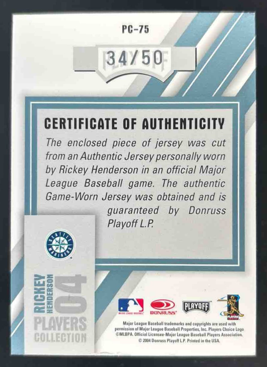 2004 Prestige Players Collection Jersey Platinum #PC-75 Rickey Henderson /50