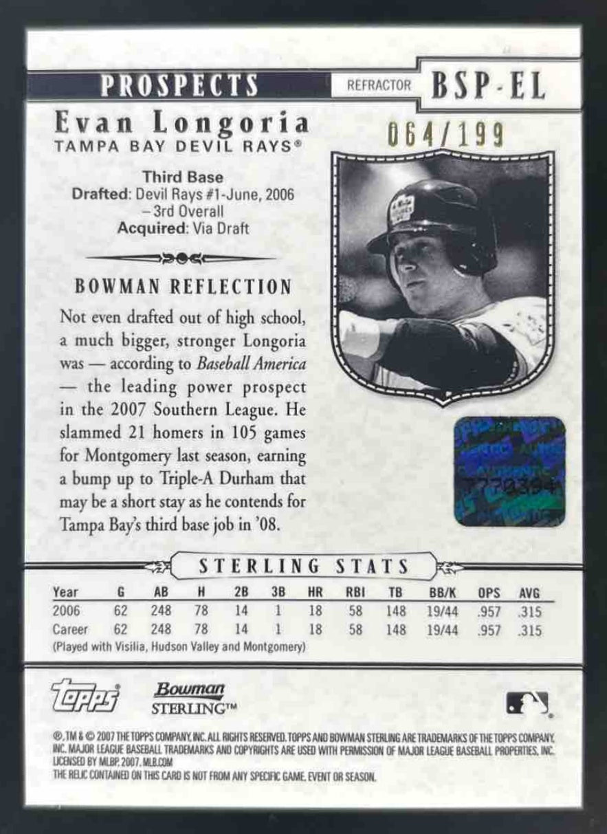 2007 Bowman Sterling Prospects Refractors #BSP-EL Evan Longoria Auto /199