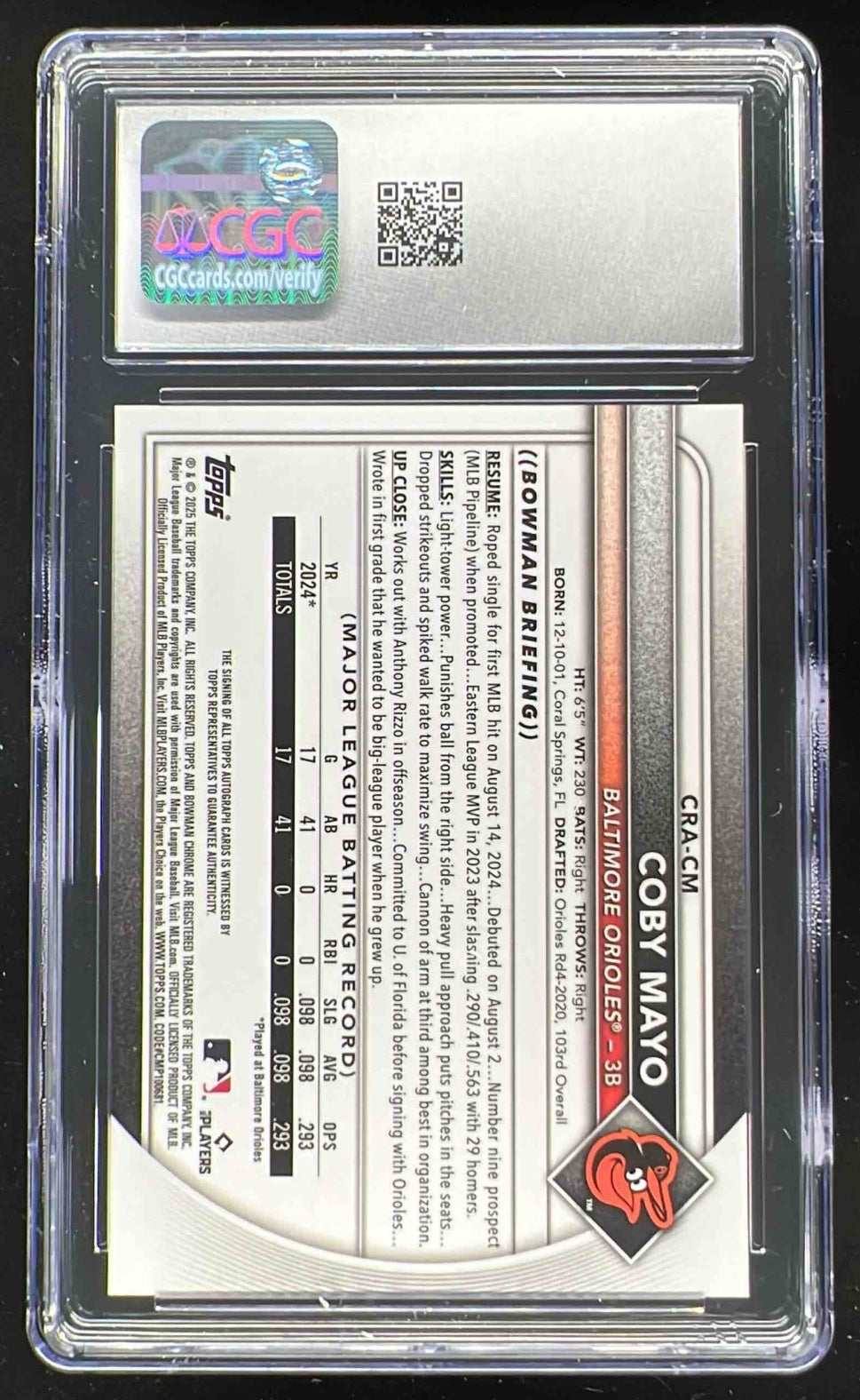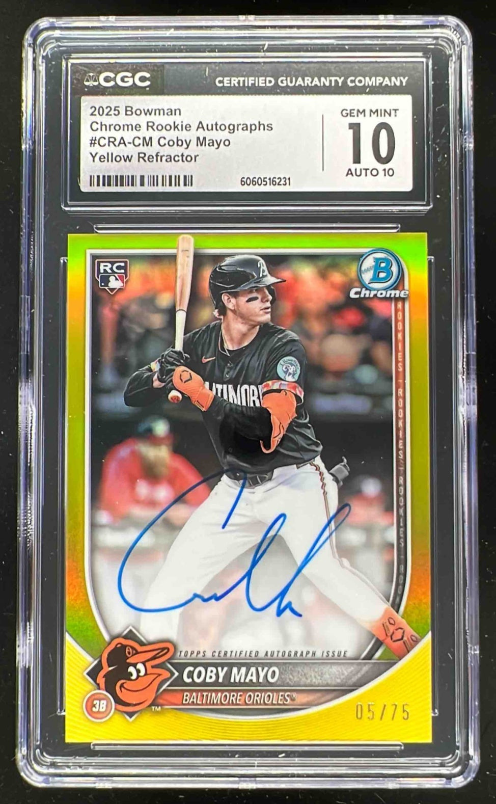 2025 Bowman Chrome Rookie Autograph Yellow Coby Mayo RC Auto /75 CGC 10
