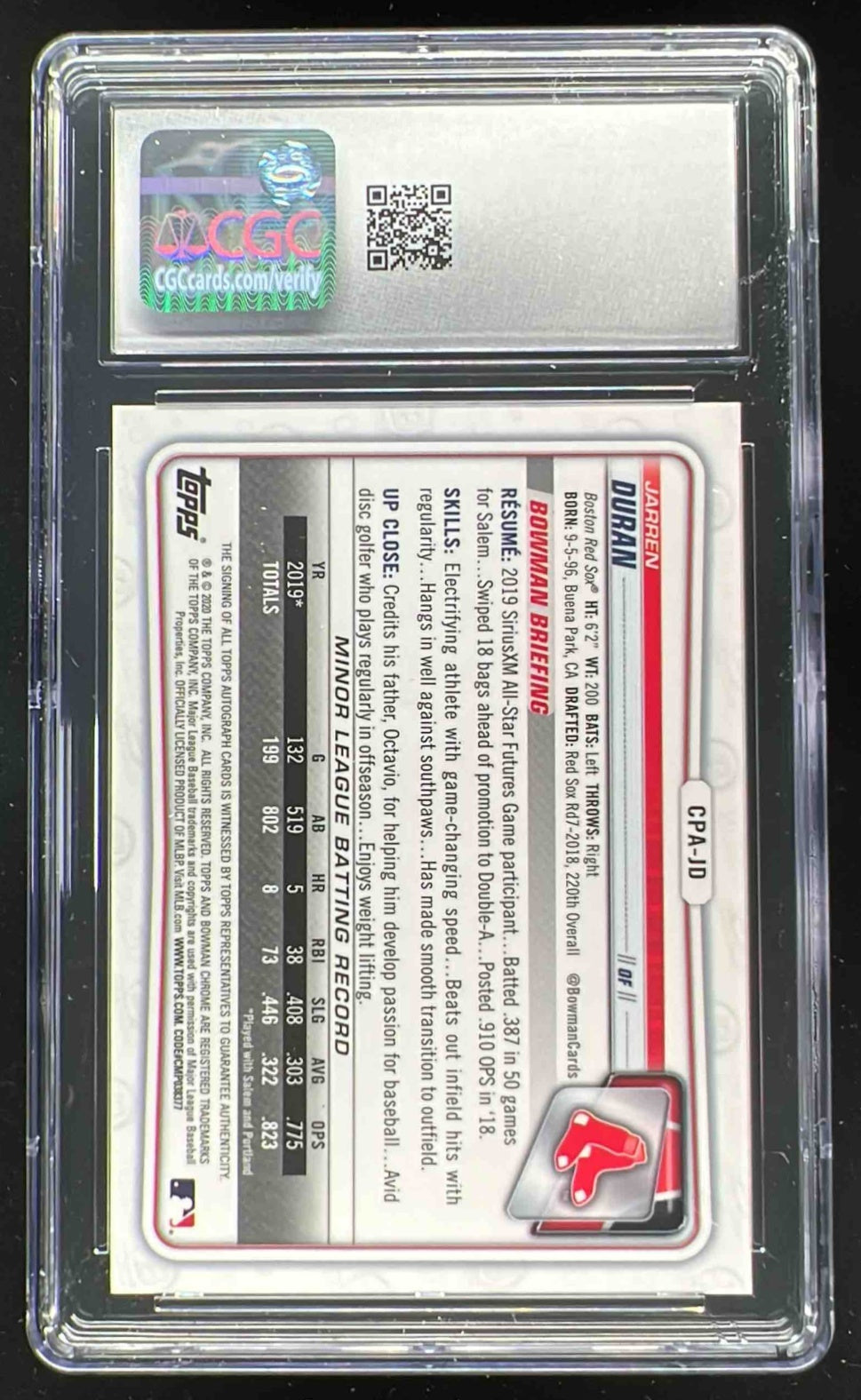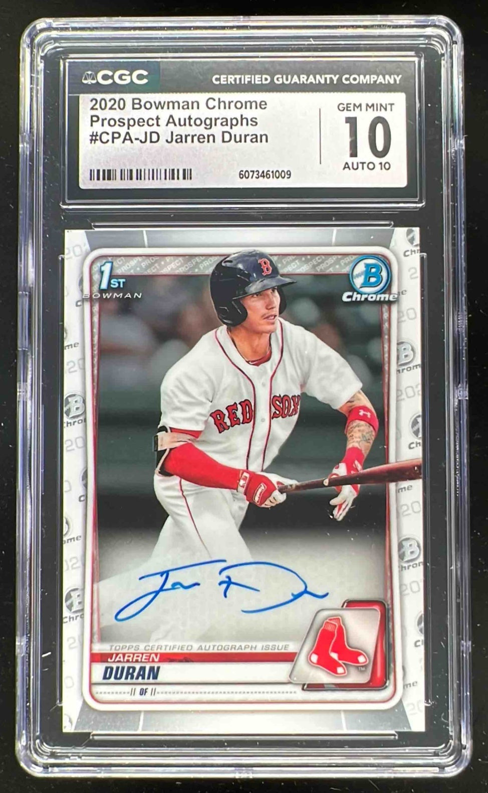 2020 Bowman Chrome Autographs #CPA-JD Jarren Duran Autograph RC Auto CGC 10