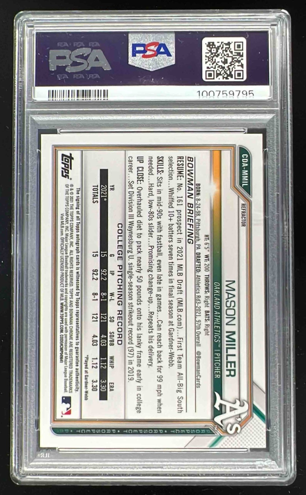 2021 Bowman Draft Chrome Pick Refractor #CDA-MMIL Mason Miller Auto /499 PSA 9