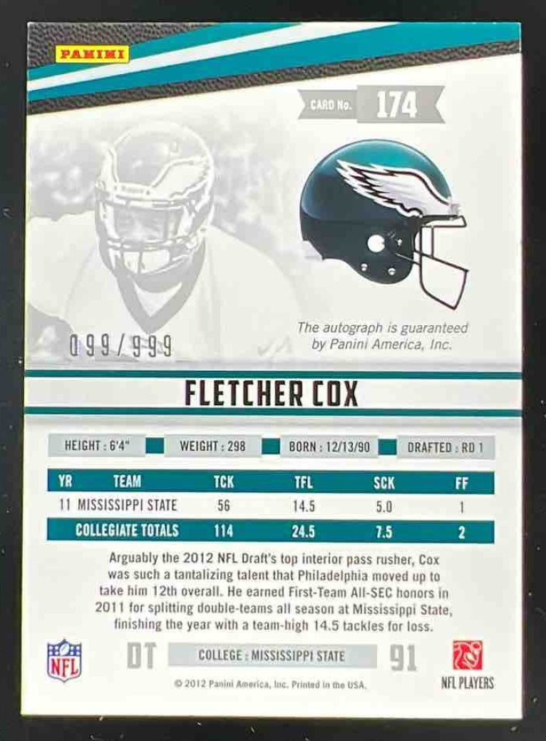 2012 Panini Rookies & Stars Autographs #174 Fletcher Cox RC Auto /999