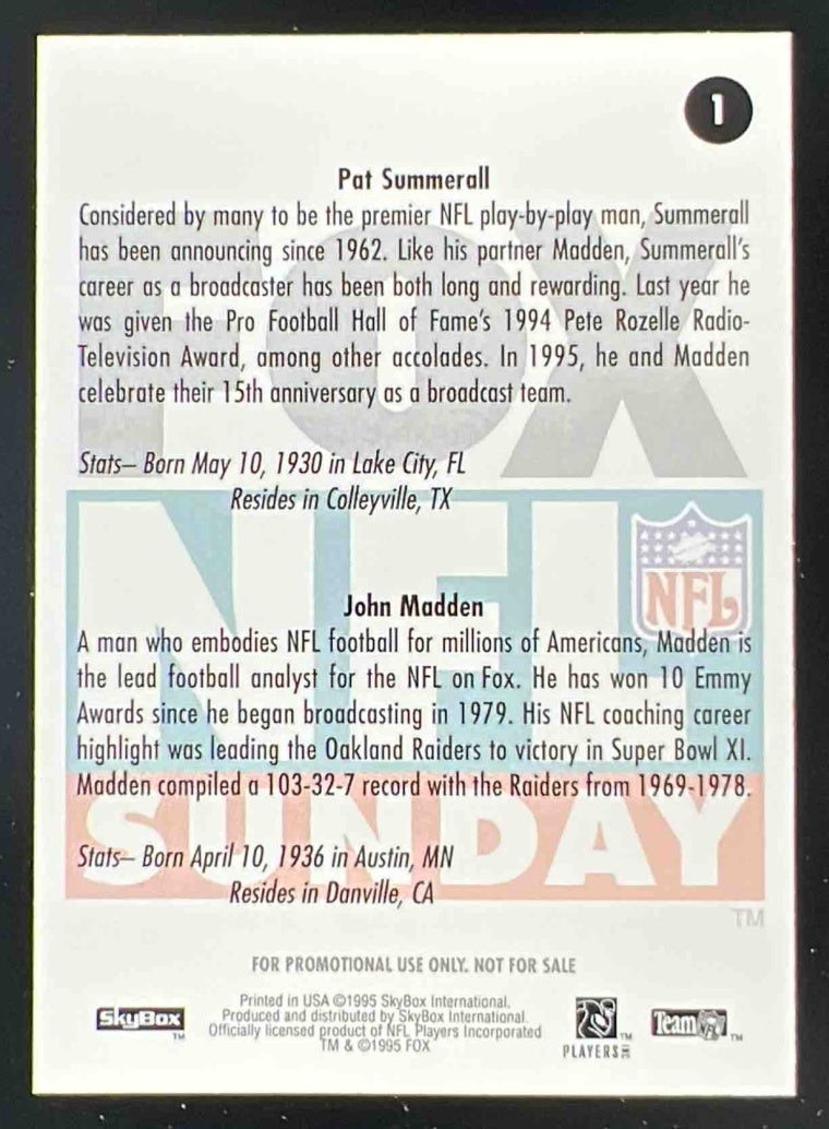 1995 Skybox Impact NFL on FOX: The Announcers #1 Pat Summerall John Madden