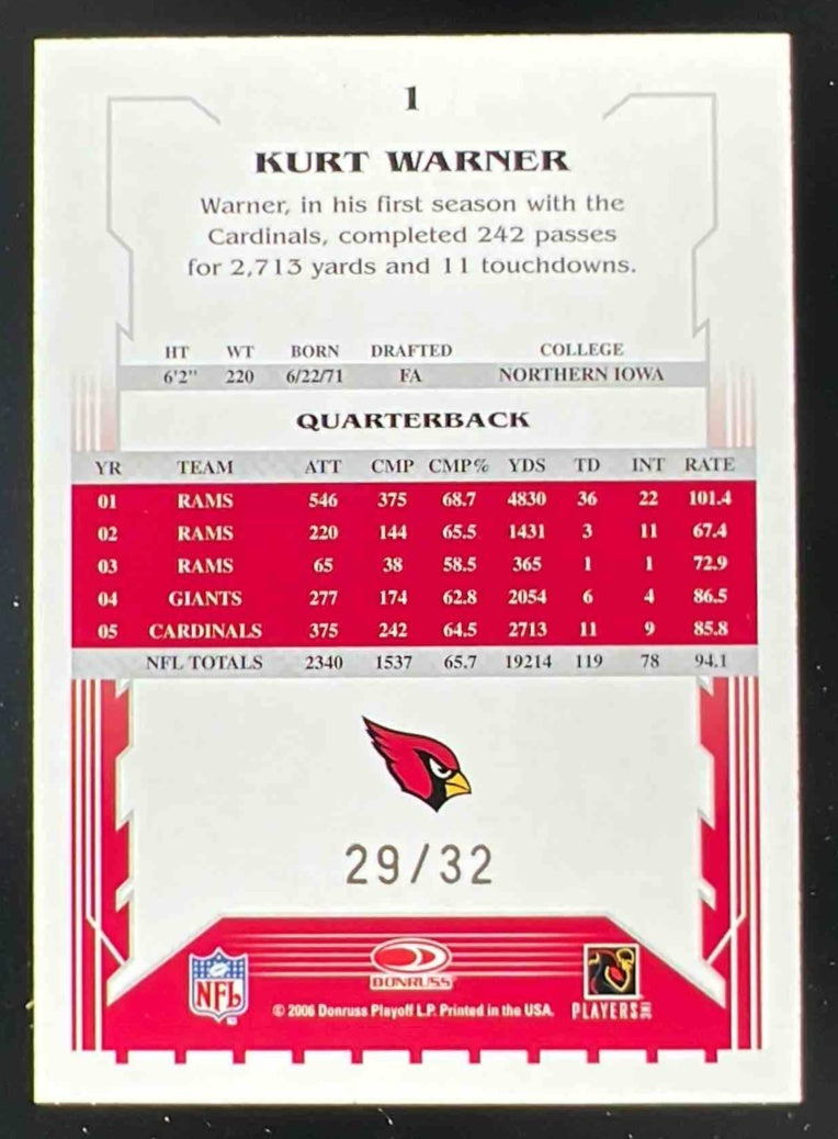 2006 Score Artist's Proof #1 Kurt Warner /32