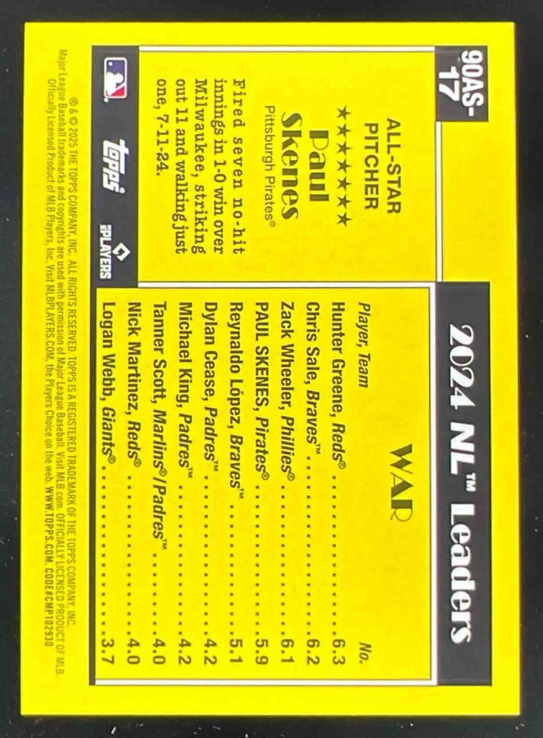 2025 Topps 1990 Baseball All-Star Green Crackle Foil #90AS-17 Paul Skenes /99