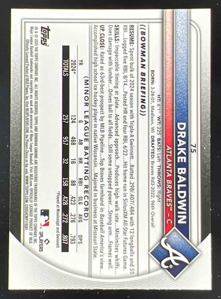 2025 Bowman Chrome Red RC Variation #75 Drake Baldwin RC