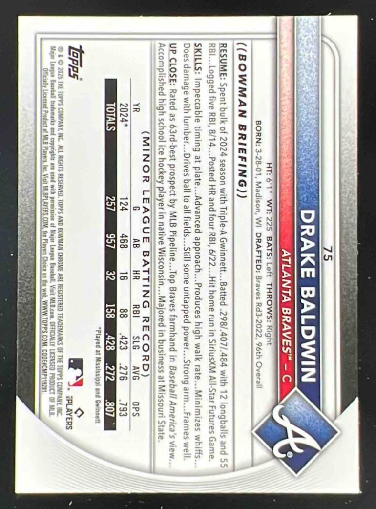 2025 Bowman Chrome Red RC Variation #75 Drake Baldwin RC