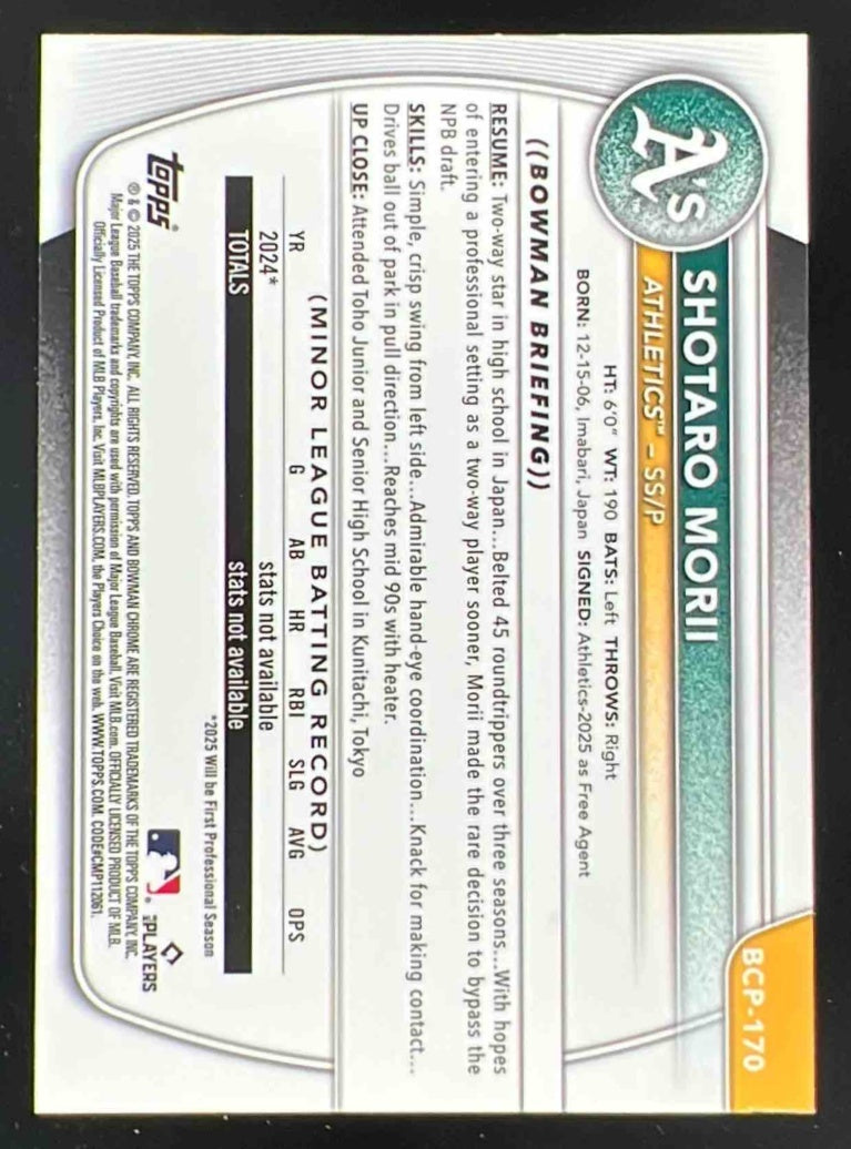 2025 Bowman Chrome Prospects Purple Refractor #BCP-170 Shotaro Morii RC /250