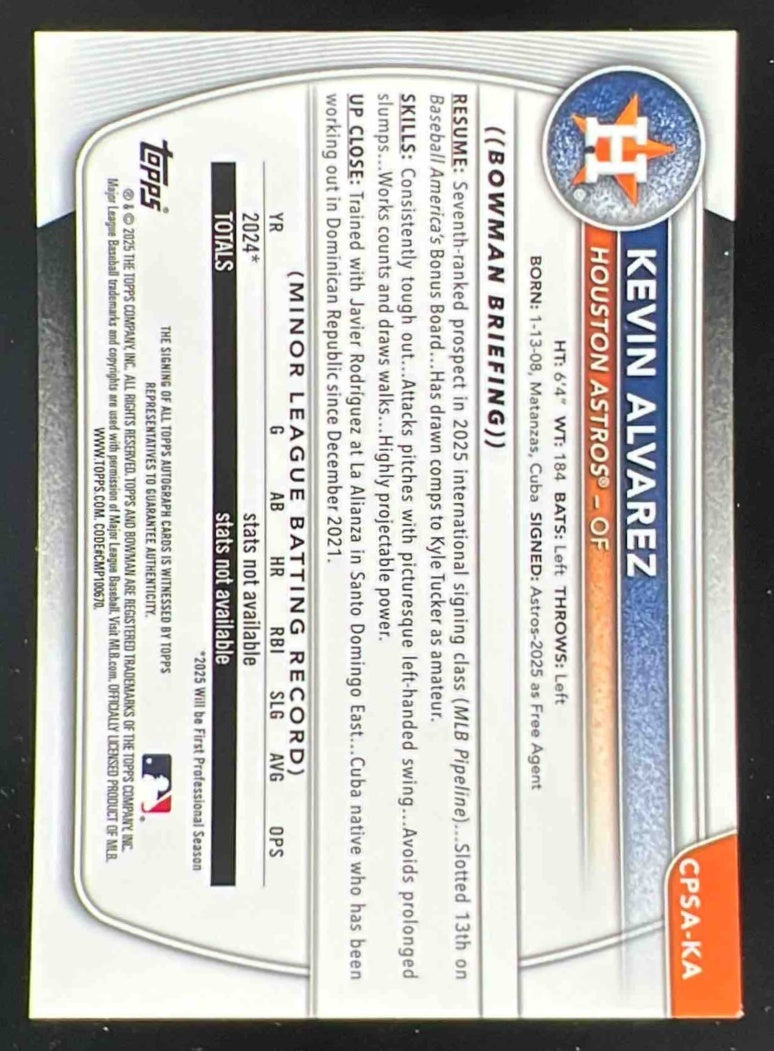 2025 Bowman Chrome Sapphire Autograph Green Refractor Kevin Alvarez RC Auto /99