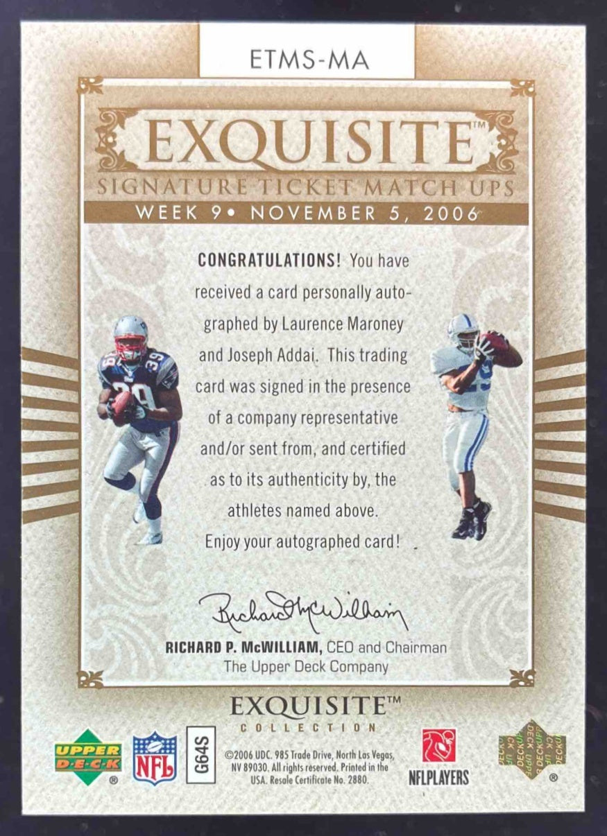 2006 Exquisite Ticket Matchup #ETMS-MA Laurence Maroney Joseph Addai Auto /25