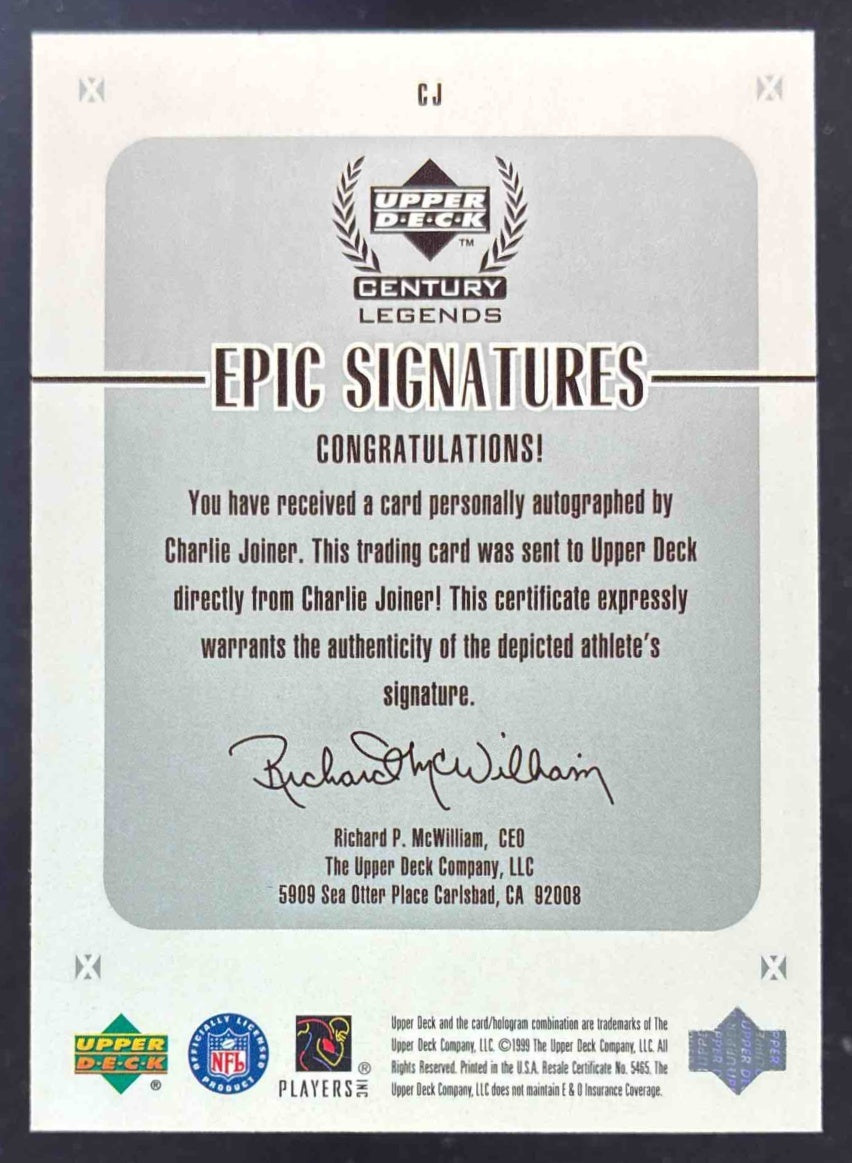 1999 Upper Deck Century Legends Epic Signatures #CJ Charlie Joiner Auto